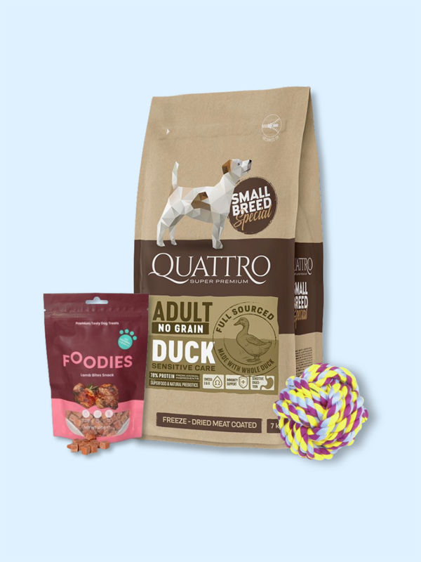 מארז לכלב בוגר מגזע קטן, קוואטרו ללא דגנים ברווז 1.5 ק"ג + חטיף + צעצוע