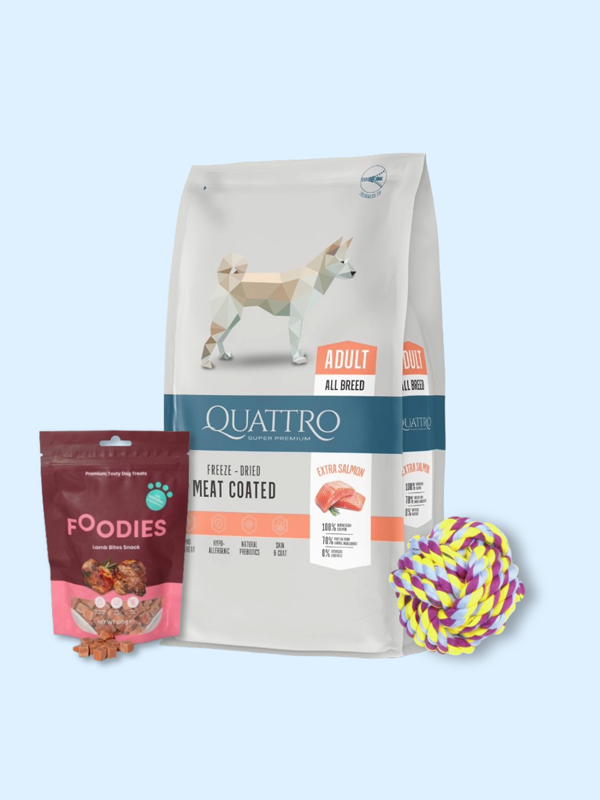 מארז All in One של PettyBite – מזון סופר פרימיום לכלבים בוגרים מכל הגזעים בטעם סלמון, יחד עם צעצוע כדור חבלים וחטיף FOODIES מפנק.