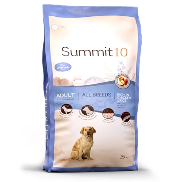 סאמיט 10 עוף ואורז הוא מזון יבש מלא המספק חלבון איכותי ופחמימות מאורז קל לעיכול. מתאים לכלבים בוגרים המחפשים תזונה מאוזנת לשימוש יומיומי.