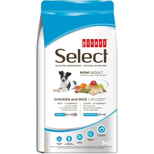 קו המזונות סלקט מיני של חברת ®Picart הספרדית מותאם בצורה מיטבית לצרכיהם של כלבים מגזע קטן, ומאופיין בערך תזונתי גבוה וויטמינים ומינרלים המסייעים בשמירה על השיניים, הלב, המפרקים, העור והפרווה.