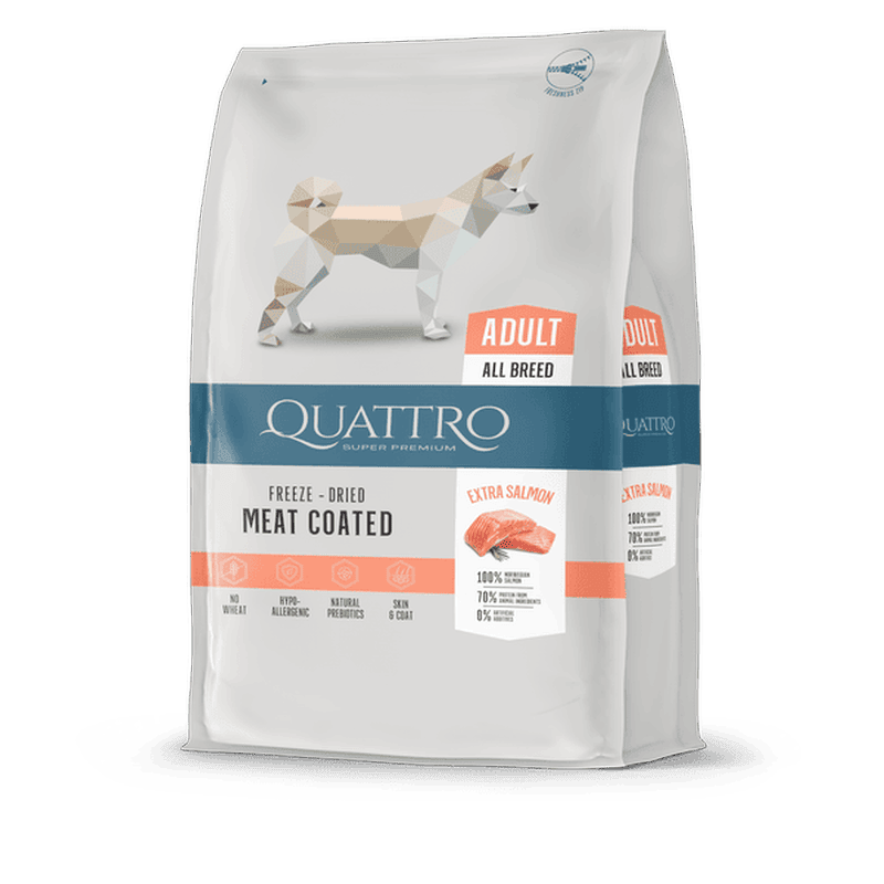 קוואטרו (QUATTRO) מציעה תזונה סופר-פרימיום איכותית, המיועדת במיוחד לכלבים בוגרים מכל הגזעים. המזון מיוצר בטכנולוגיה חדשנית של ציפוי סלמון מיובש בהקפאה (Freeze-Dried), השומרת על טעמו הטבעי של הדג ועל הערכים התזונתיים החיוניים שבו. אפילו הכלבים הבררנים ביותר לא יעמדו בפניו.