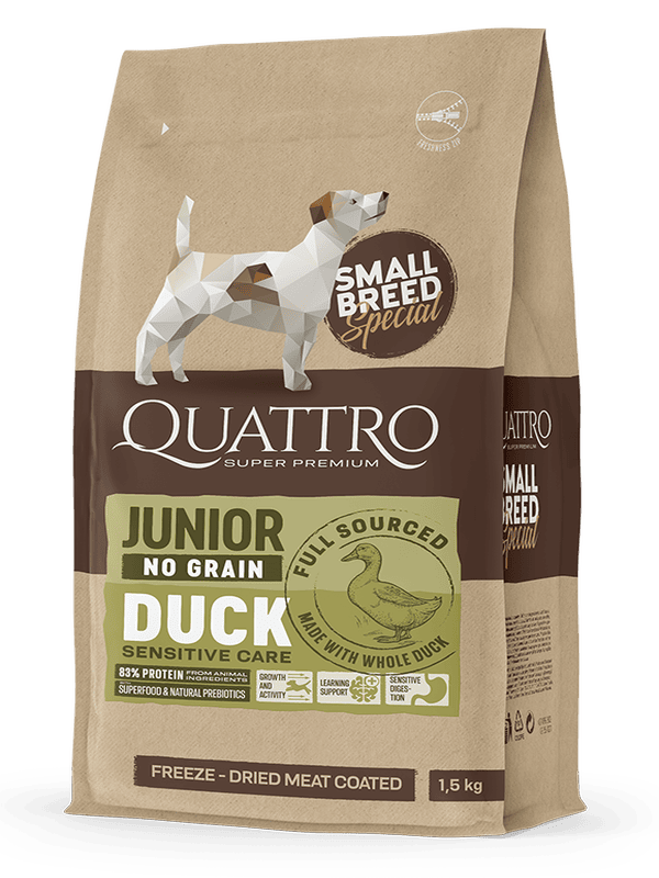 קוואטרו מזון יבש מלא עבור כלבים צעירים (2-12 חודשים) מגזעים קטנים | ברווז, תפוח אדמה ובטטה | ללא דגנים